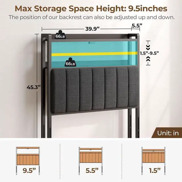 Large Storage Space: Headboard with two levels of storage.The height of the first level storage space can be adjusted up to 9.5 inches, which can store almost all the items we use in bed every day, such as: mobile phones, books, tablets, watches, headphones, etc.. The size of the storage space can be adjusted according to your actual needs. The maximum load-bearing capacity of each layer is 66lbs