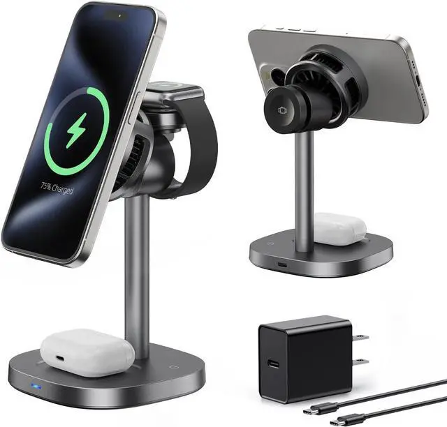 3 in 1 Wireless Charging Station, Qi2 15W Cooling Magnetic Charging Stand, MagSafe Fast Wireless Charger for iPhone 17/16/15/14 Series, Apple Watch, AirPods, 45W Adapter Included