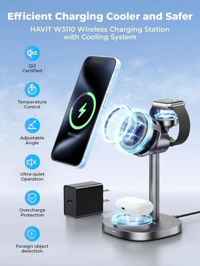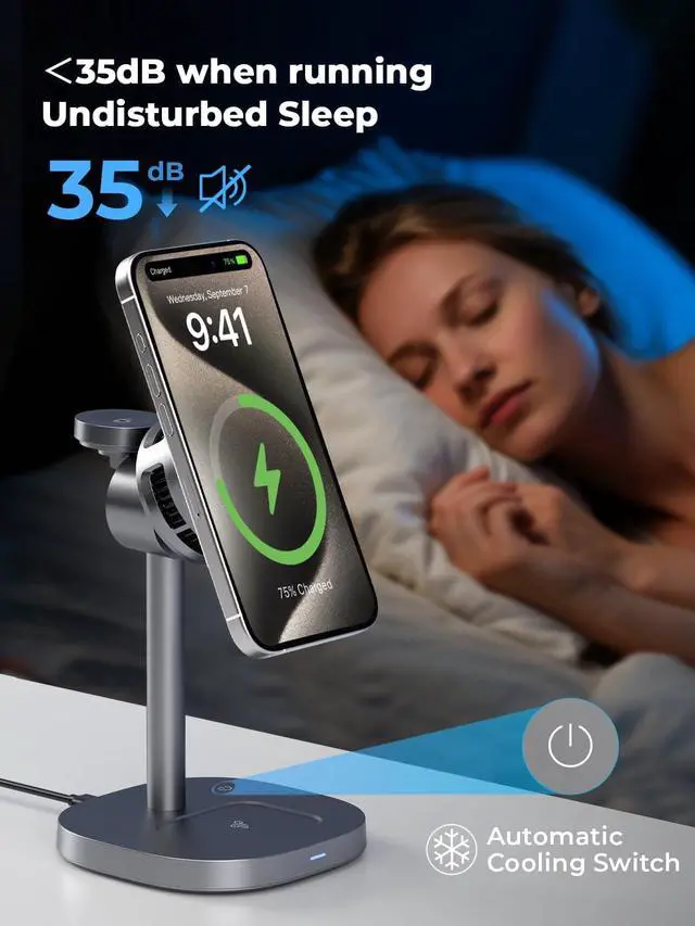 TEC Semiconductor Cooling Technology Desktop 3-in-1 Wireless Charging Station: Say goodbye to overheating and power drop issues during wireless charging. Deploy revolutionary thermoelectric cooling technology able to automatically sense the temperature of the phone to cool it down, ensures stable and efficient charging performance