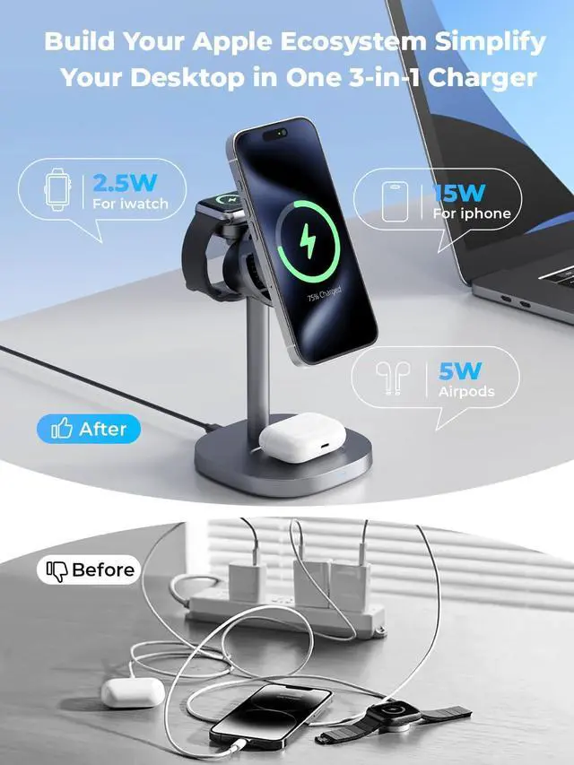 Includes 45W Power Adapter & USB-C Cable No Power Drop When Charging Multiple Devices: No need to worry about slower charging when using all three charging pads at once. The included 45W fast charger and USB-C cable ensure full-speed charging for your phone, earbuds, and smartwatch simultaneously