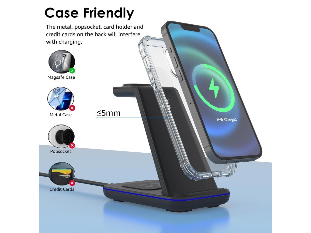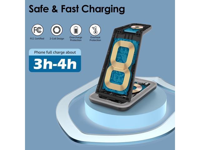 Upgraded Design With Upright & Two-Built-In Coils & Ergonomic design, this 3 in 1 wireless charger stand allows you have a chat conference or a video while charging. And the charger uses a Comprehensive-Heat-Sink and Non-Slip-Pad design, so you have no worry about overheating or product being accidentally knocked over by the kitty when charging your devices.
