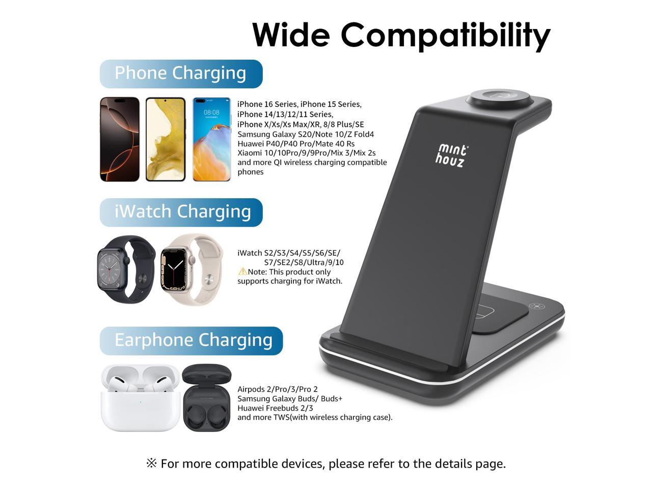 Universal Compatibility Minthouz 3 in 1 wireless charging station is compatible with iPhone 16/15/14/13/12/11 serious, Samsung Galaxy S/Note series and More.