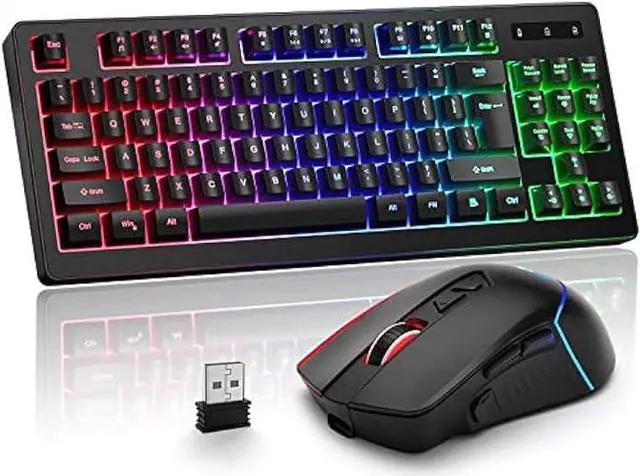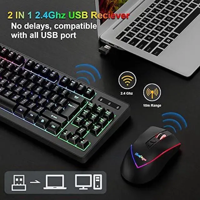 BlueFinger Wireless Gaming Keyboard and Mouse Combo, Long Lasting Rechargeable Battery 87 Keys RGB Rainbow Backlit Gaming Keyboard & Ergonomic Light Up Gaming Mice for Mac Laptop Computer PC Gamer