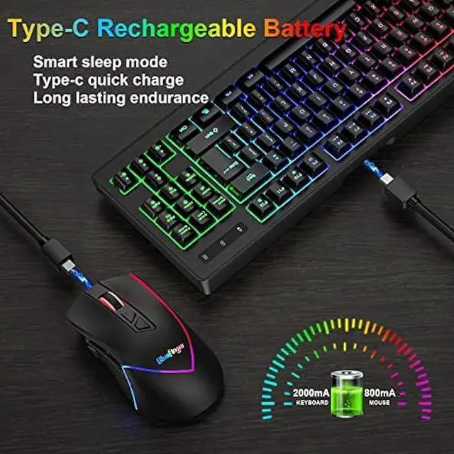 Rechargeable & Long Battery Life: The keyboard equipped 2000mAh battery, mouse 800mAh battery; Only needs to be charged for 6-8 hours by 1.5 m Type-C cable (supplied); The long battery life allow you to use them continuously for more than 40 hours with light. Also come with power saving mode, If there is no operation within 6-8 minutes, they will automatically enter sleeping mode. Please charge 8 hours before using.