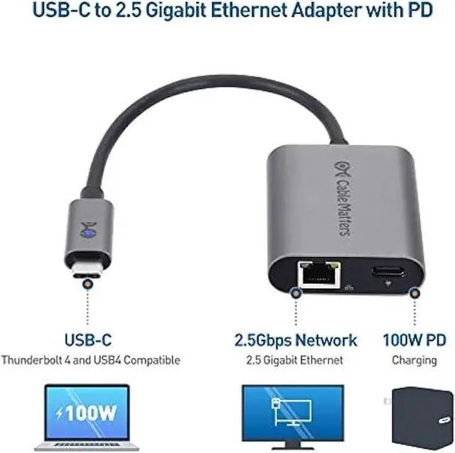 Thunderbolt 4 to Ethernet Adapter with charging supports 2500 Mbps Ethernet network. It provides up to 100 watts of power delivery to a smartphone or laptop; Maximize the utility of a single Thunderbolt 3 or Thunderbolt 4 port to add a 2.5G Ethernet port while charging your computer with this USB C Ethernet adapter 2.5 gigabit; Bus-powered USB Type-C to 2.5 g Ethernet adapter does not require a connection to a USB-C charger in order to function