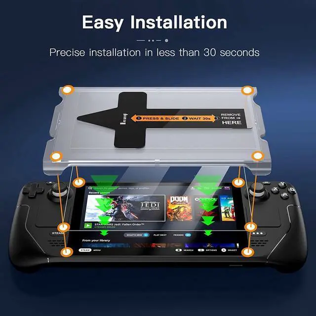 Easy Installation Tempered Glass Film with auto-alignment Installation tool can be installed in seconds and bubble free, and fits perfectly for your Steam Deck. If you don' t know how to operate, the installation video is attached for teaching you how to use it.