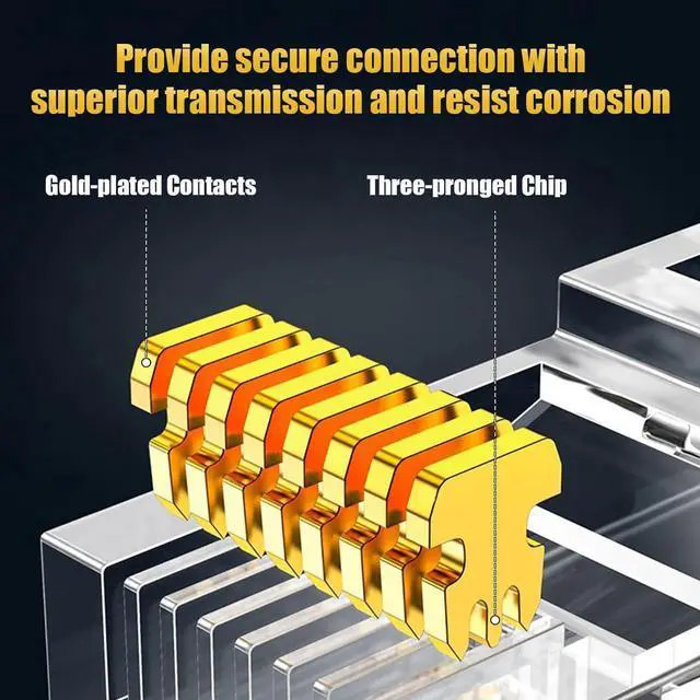 Secure ConnectionEthernet ends with gold plated 8P8C contacts and three-pronged chip to provide superior transmission and resist corrosion