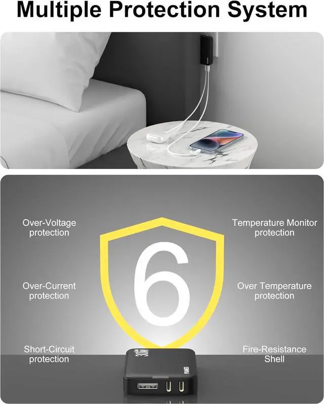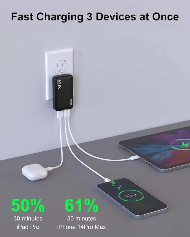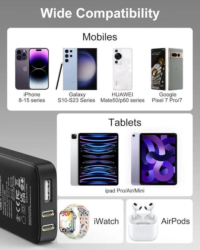 30W flat usb c charging block uses the most powerful device compatibility scheme and multiple fast charging protocols to charge up to 3 devices simultaneously, with broad support for multiple devices: iPhone 14 Pro Max/14/13/12/11, iPad/ iPad Pro/ Tablet, Galaxy S23 Ultra/S22, and More.