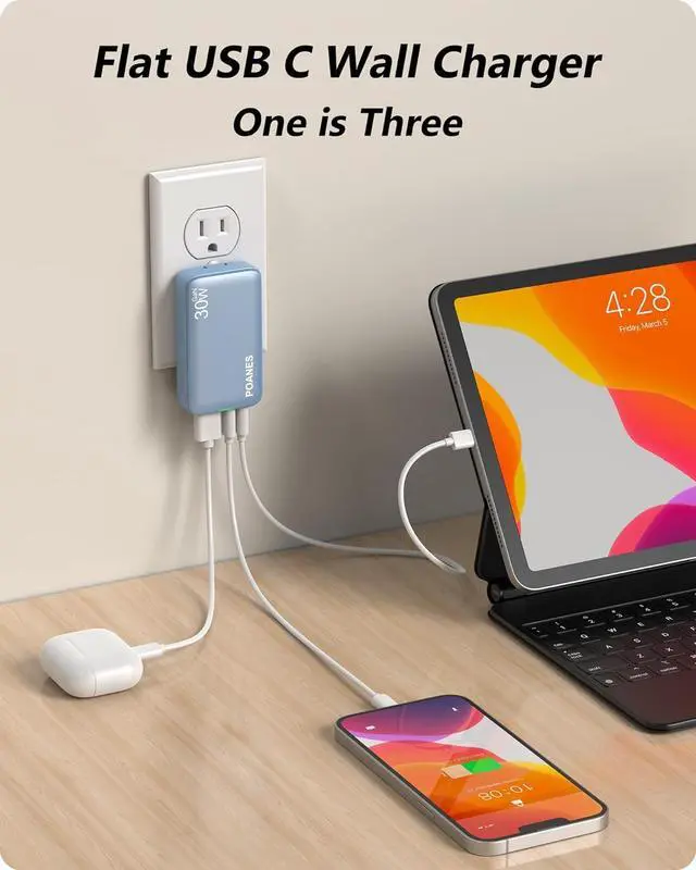 30W flat usb c charging block uses the most powerful device compatibility scheme and multiple fast charging protocols to charge up to 3 devices simultaneously, with broad support for multiple devices: iPhone 14 Pro Max/14/13/12/11, iPad/ iPad Pro/ Tablet, Galaxy S23 Ultra/S22, and More.
