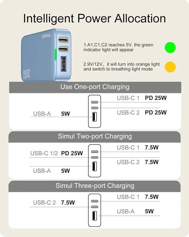 30W type c flat wall charger built-in unique breathing light design, more scientific and technological sense. When the flat usb c wall charger is used, 1: LED