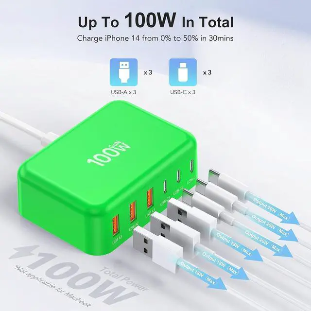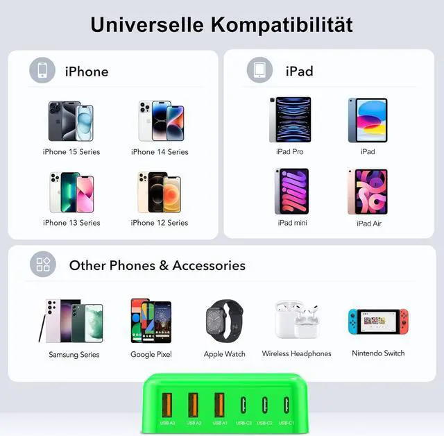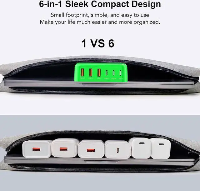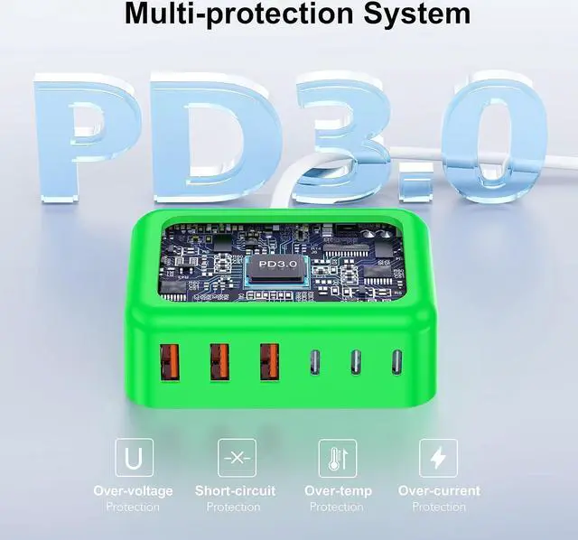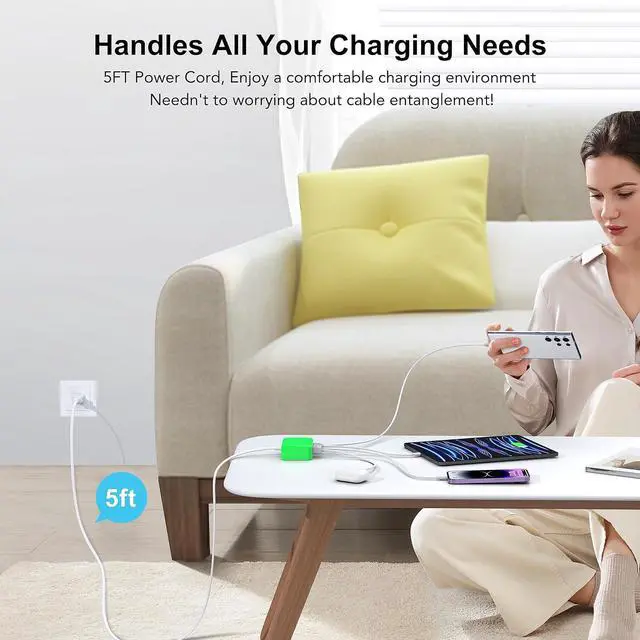 Multiport USB C Charger Station perfectly charges multiple devices for home, office and travel. Small size saves you 50% space and fits easily into pockets, handbags, travel cases. The design with 5FT AC extension cable allows you to charge as you want without worrying about the limitation of distance.