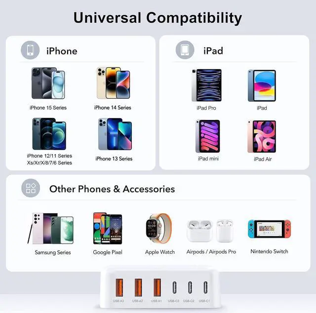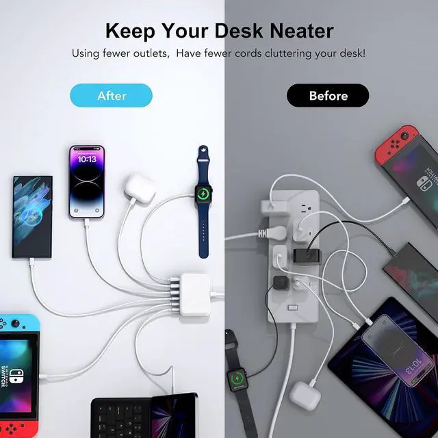 Multiport USB C Charger Station perfectly charges multiple devices for home, office and travel. Small size saves you 50% space and fits easily into pockets, handbags, travel cases. The design with 5FT AC extension cable allows you to charge as you want without worrying about the limitation of distance.