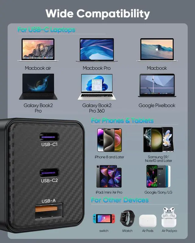 Our usb c and usb a wall charger block can extremely meet all your charging needs. Compatible with MacBook Air, iPad Pro/Air/Mini; Fast charge your iPhone 15/15Pro/15Pro Max/15Plus/14/14 Pro/14 Pro Max/14 Plus/13/13 Mini/13 Pro/13 Pro Max /12/12 Mini/12 Pro/12 Pro Max, iPhone 11/11 Pro/11 Pro Max, iPhone XS / XS Max / XR / X, Galaxy S23/S22/S10, Switch, and more other laptops, tablets and phones.