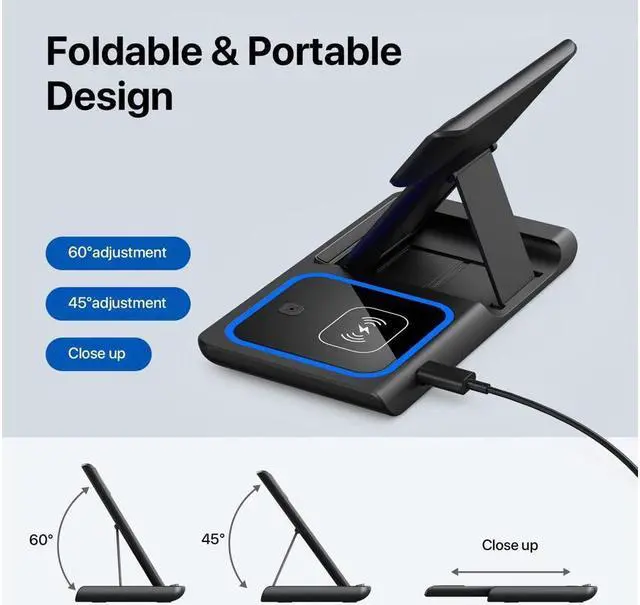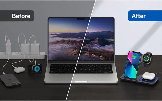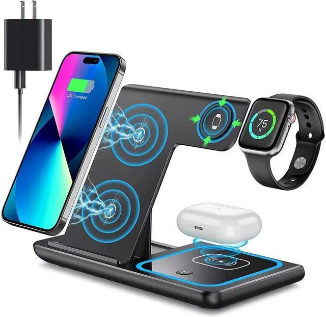 3-in-1 Fast Wireless Charging Station: The wireless charging station charges your iPhone, iWatch, Airpods and other phones that can wirelessly charge at the same time - up to 15W total power for fast charging.