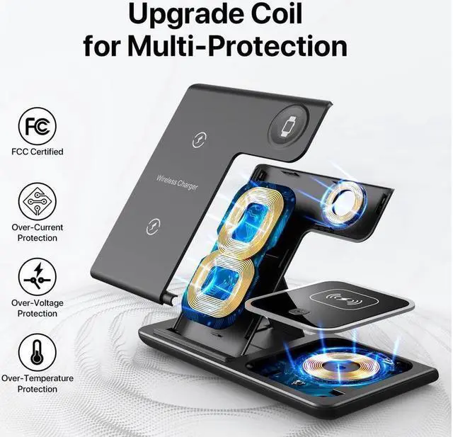 Safe Wireless Charging Dock: The wireless phone charger Dual-coil design ensures a wider charging area in landscape or portrait orientation.With over-current protection, over-voltage protection and over-temperature protection, as well as foreign