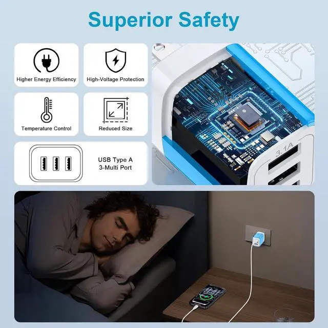USB Charger: 3-USB output with total current 5V/ 3.1A and input with 100-240V enables you to charge 3 devices simultaneously at high speed. It can really save your timeSafety