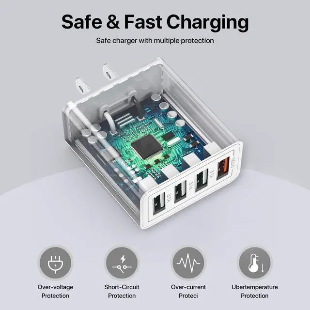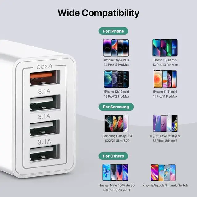 • USB Charger 4 Port USBA Wall Charging Block Fast Charge QC 3.0 Plug Adapter Compatible with iPhone 12/13/14/15/XS/XS Max/XR/X LG Google Pixel and More