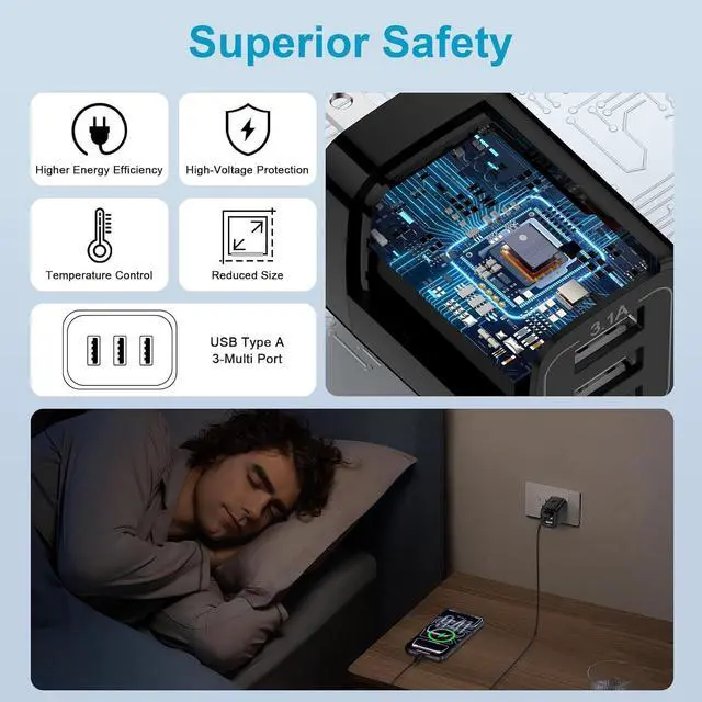 USB Charger: 3-USB output with total current 5V/ 3.1A and input with 100-240V enables you to charge 3 devices simultaneously at high speed. It can really save your timeSafety