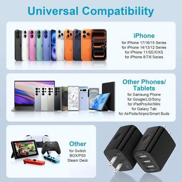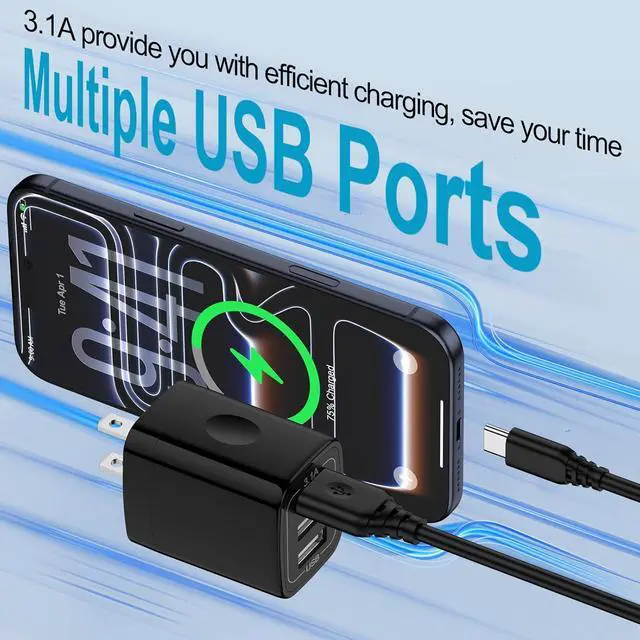 Wide Compatibility: Works for iPhone 17e/17/17 Pro/17 Pro Max/Air/16e/16/16 Pro/16 Pro Max/16 Plus/15/15 Pro/15 Pro Max/15 Plus/14/14 Pro/14 Pro Max/13 Pro Max/13/12/11 Pro Max/XR/XS/X/8/7/6S Plus/SE iPad Pro/Air 2/Mini 2 3 4 5 Galaxy S26 S25 S24 S23 S22 S21 Ultra S20 FE S10e S10 S9 S8 Plus A17 A16 A26 A36 A56 A15 A55 A35 A32 A13 A20e A10e Note20 Ultra LG G8 G7 V60 V50 ThinQ Stylo 6 5 4 HTC Google Pixel 10a/10/10 Pro/10 Pro XL/10 Pro Fold/9a/9/9 Pro/9 Pro XL/9 Pro Fold/8a/8/8 Pro/8/7a/7/7 Pro/6/6a/6 Pro/5a/5/4a/XL Oneplus Sony Nokia MP3 players smartphones e-book readers Bluetooth speaker more3-Port