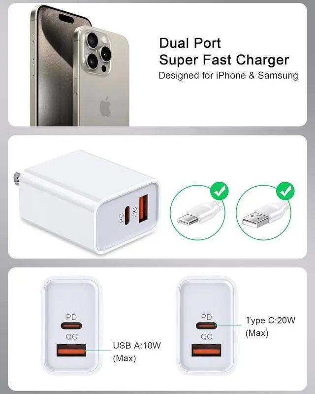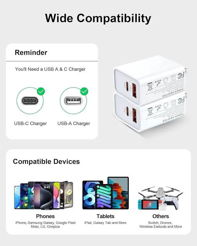Other: OnePlus 12/11 Moto Edge/G Power Galaxy Buds iPads and more. Dual Port Efficiency for Google 10 9 Phones Equipped with a USB-C (Power Delivery) and a USB-A (Quick Charge 3.0 ) port; Eliminates the need for multiple bulky bricks; Ideal for connecting to various charging cables to power up your pixel phone tablet or smartwatch at the same time from a single outlet. Compact & Travel-Friendly Wall Plug Ultra-portable profile with a lightweight design perfect for backpacks purses or travel carry-ons The sleek cube shape fits easily into tight socket spaces without blocking neighboring outlets Global voltage compatibility (100V-240V) makes it the ideal companion for international travel. Smart Safety Protection Cargador de Pared This Google Pixel Power Adapter features built-in over-voltage over-current over-heat and short-circuit protection to ensure safe charging for your Pixel 9a overnight or during heavy use. Certified to protect your Google Pixel battery longevity and prevent device damage. What You Get 2 × 20W Dual Port Google Pixel Power Adapters (USB-C + USB-A); Backed by a LIFETIME worry-free warranty and responsive customer support for your Google Pixel devices or other Android & phones/iPads.