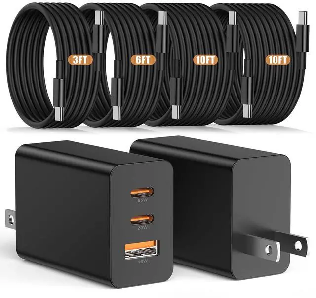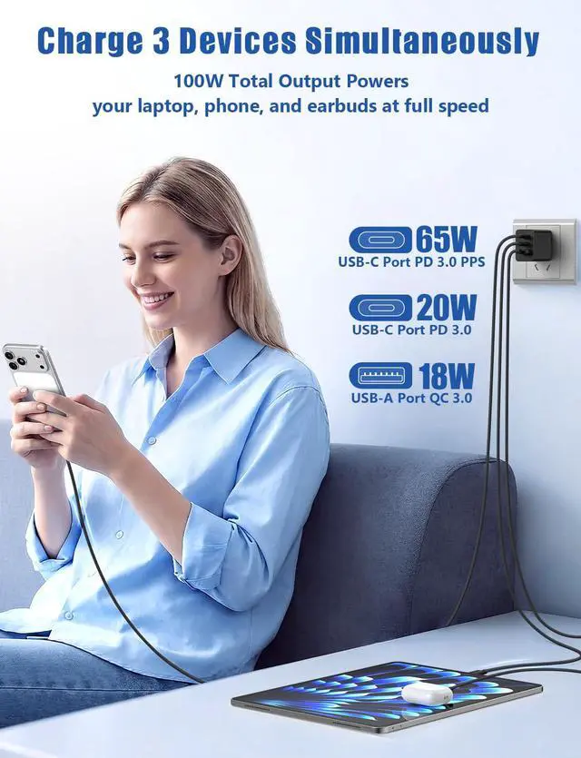 Super Fast Wall Charger: Tired of tangled cables and a messy desk? Our 3-in-1 GaN Charger? with dual PD 3.0 USB-C ports (65W+20W)? and a QC 3.0 USB-A port (18W) it delivers a total 100W output? to charge for laptop phone and earbuds simultaneously at full speed all while keeping your space tidy and ultra-portable65W Fast Charging for