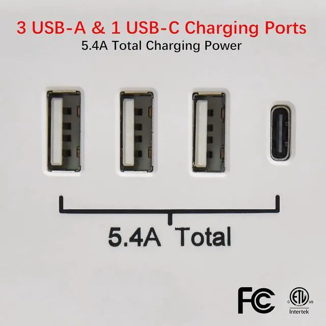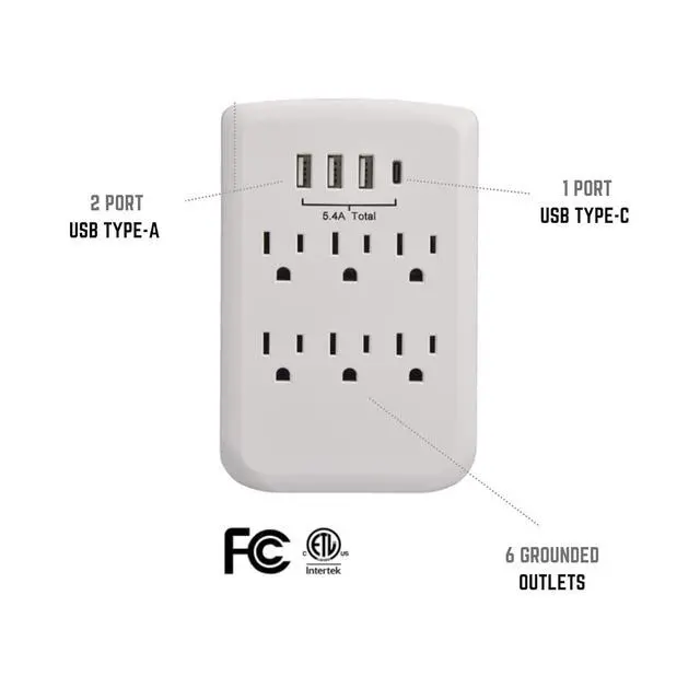 Turns a standard duplex receptacle into 6 outlets3-port 2.4 amp USB-A and 1-port 3amp USB-C chargers for the latest cellphones tablets Bluetooth and other small electronicsIdeal for bedrooms offices dens wherever charging ports are neededcETLus tested and listed for indoor use in the USA & Canada