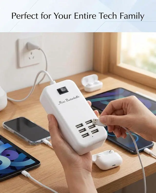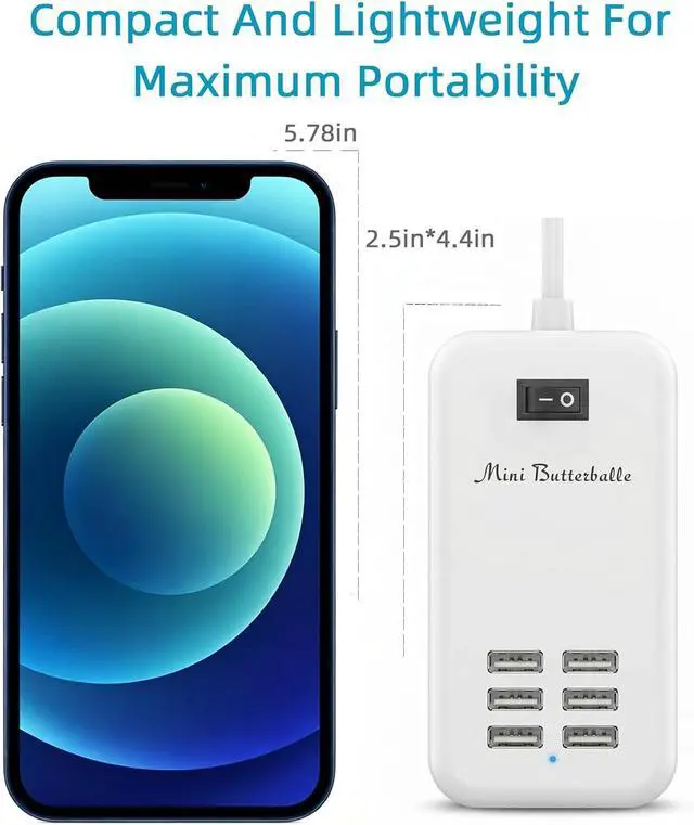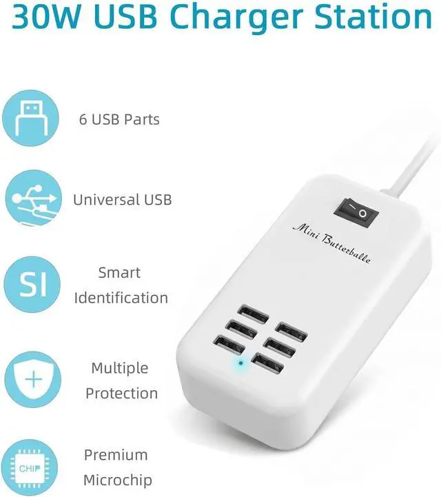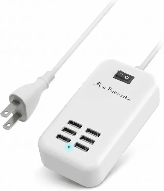 Universal Wide Voltage 6-Port Charging Station - This multi-port USB charging hub features wide AC input from 100V to 240V which ensures stable and steady power output for continuous charging. As a universal USB wall charger and desktop charging adapter it is perfectly compatible with almost all 5V DC input smartphones tablets earphones power banks and other daily USB electronic devices. User-Friendly Power Switch & Extended 5FT Power Cord - Designed with independent ON/OFF master power switch this multiple USB charger allows long-time plug-in use without frequent plugging and unplugging. The 5-foot long durable power cable greatly extends placement distance making this home charging station ideal for bedside office desk countertop and household daily charging use.