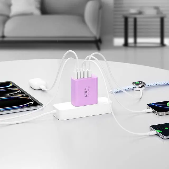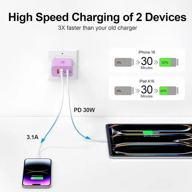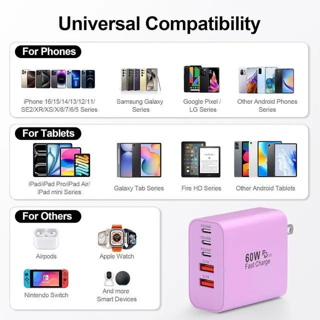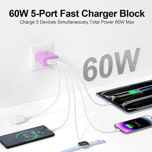 60W Fast Charging BlockThe USB C charger supports the Power Delivery and Quick Charge 3.0 fast charging functions with a total power of up to 60W. The USB-C port offers a charging speed of 30W while the USB-A port offers an output power of 5V/ 3.1A. Charge your iPhone devices from 0% to 60% in just 30 minutes 3X faster than original chargerHigh Speed ChargingUSBC fast charger block with 5-ports (3 USB-C ports and dual USB-A ports). When you connect 2-5 devices the power will be distributed efficiently between ports to ensure you get the best charge to minimize waiting timeSuperior SafetyComply with ETL safety standards this USB C fast charging block equipped with a wide range of safety features including temperature control short circuit protection and current regulation to protect your connected devices and maximize the life of your devicesWidely CompatibilityThe Type C charger block offers 30W fast charging for iPhone 17/17 Pro/17 Pro Max/Air/16/16 Pro/16 Pro Max/16 Max/16e/15/15 Pro/15 Pro Max/15 Max/14/14 Pro/14 Pro Max/13/13 Pro/13 Pro Max/12/12 Mini/12 Pro/12 Pro Max/SE/11/11 Pro/11 Pro Max/XS/XS Max/XR/X/8 Plus/8 iPad iPad Pro iPad mini iPad Air Airpods Galaxy S25/S25+/S25 Ultra/S25 Edge/S24/S23/S22/S21/S20/S10/S9/Note 20/Note 10/A16/A26/A36/A56/A14/A34/A54/Z Fold7/Z Flip 7/Z Fold 6/Z Flip 6/Z Fold 5/Z Flip 5 Galaxy Tab LG Google Pixel tablet Android phone and more USB and USB C devicesWhat you get60W 5-Port USBC charger block (Purple).