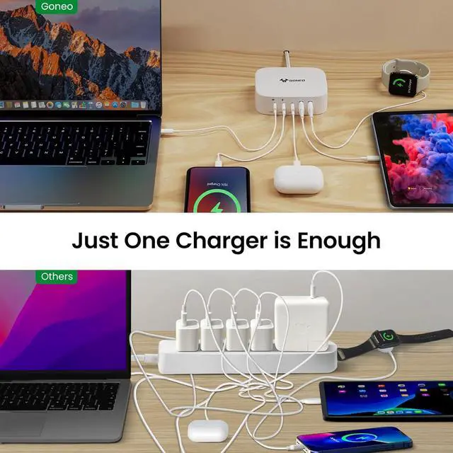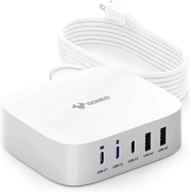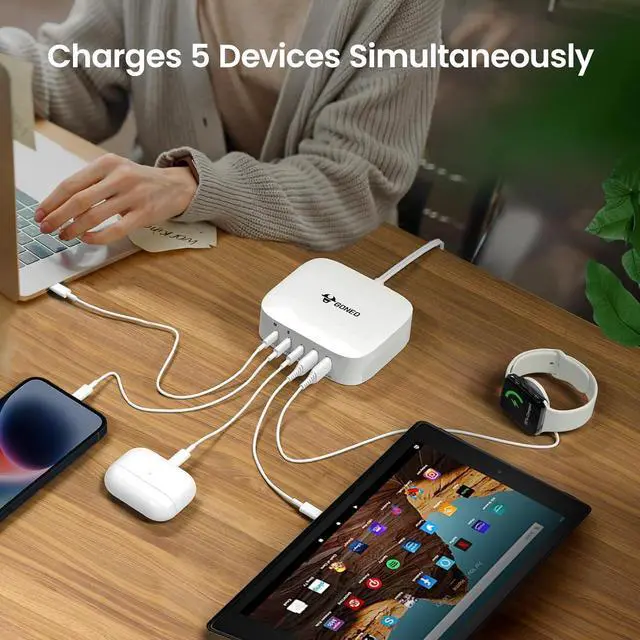 Fast-Speed Charging Station: Only 30 minutes charge your phone to 60%. 5 in 1 Charging blocks with 3 x USB C PD 3.0 port 2 x USB port this charger supports a maximum output of 67 watt in total. No need to wait it can charge your watch earphone mobile phone fan and other 5 different devices at the same time.