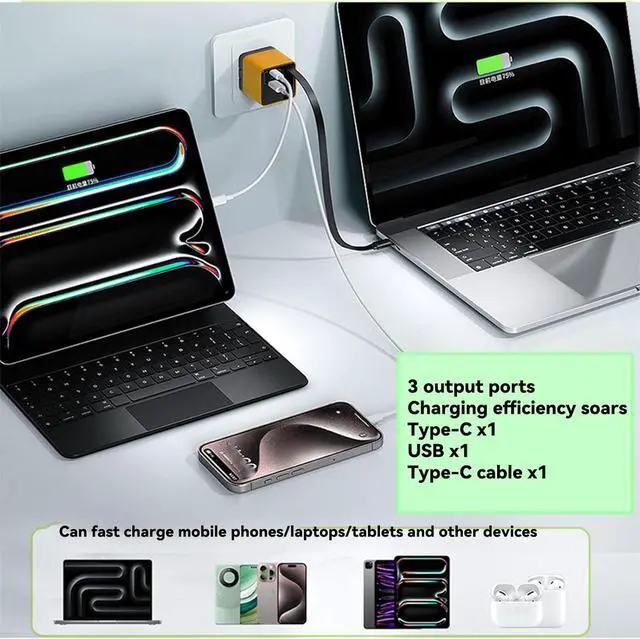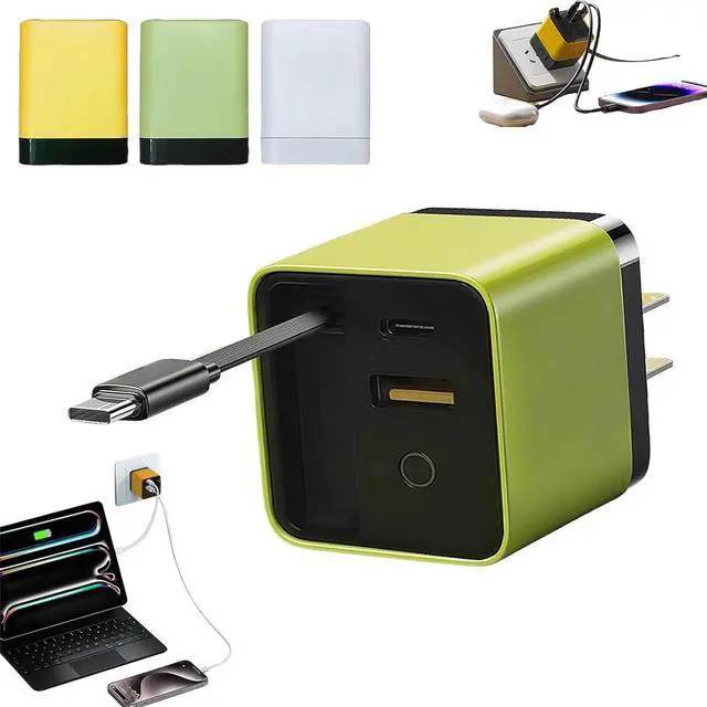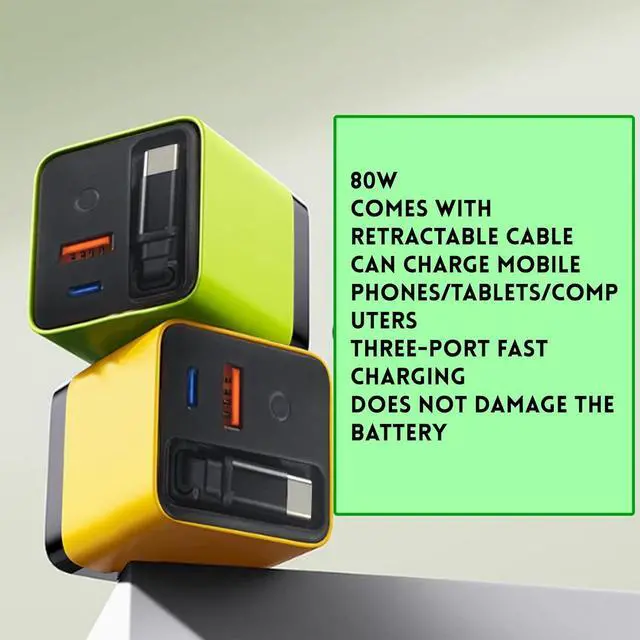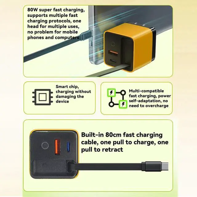 80W 3 ultra-fast charging: Using advanced 3 technology it supports up to 80W high-power output and can quickly charge mobile phones tablets and laptops which is efficient and time-savingCompact and foldable portable travel: Folding plug design the volume is as light as a pocket easy to put into a bag and can meet charging needs at any time during business tripsThree ports are charged at the same time efficient and space-saving: 1 retractable Type-C interface + 2 USB ports three devices can be quickly charged at the same time say goodbye to clutter suitable for desktop travelIntelligent compatibility with multiple protocols: Supports mainstream fast charging protocols such as PD/QC/PPS and is compatible with multiple brands of devices such as and Android and can handle all with one charge 31.5 -inch retractable cable flexible storage: built-in retractable Type-C interface free adjustment of length one-click retraction after use say goodbye to the trouble of wire entanglement
