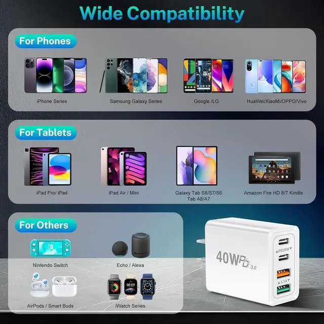 40W USB-C Wall Charger made to charge a variety of USB powered devices, compatible with i-Phone 13/13 Mini/13 Pro/13 Pro Max/12/12 Pro Max/11/XS/XR/X/8 Plus, Pad Pro/Air/Mini, Ai-r-Pods Pro Max, Galaxy S21/S20/S10/Note 10/9, Go-o-gle Pixel 6 5 and others.