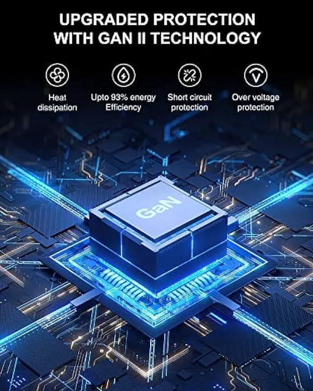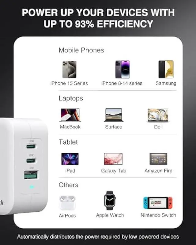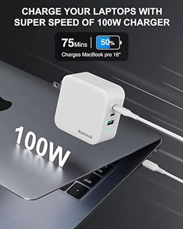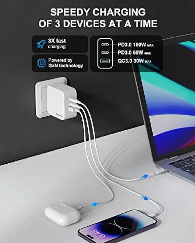 A Speed You Need! This 100w GaN charger offers 3x Fast charging with 93% efficiency, with 2 USB C port (PD 3.0 )+1 USB A port (QC 3.0 ) it will charge your laptop, mobile and AirPods at the same time, smartly detects the required power of connected devices. The 100W power of USB C wall charger is enough to charge your iPhone 13 pro max and Samsung galaxy in just 30 minutes (USB C cable excluded). Get ready to power up in flash!