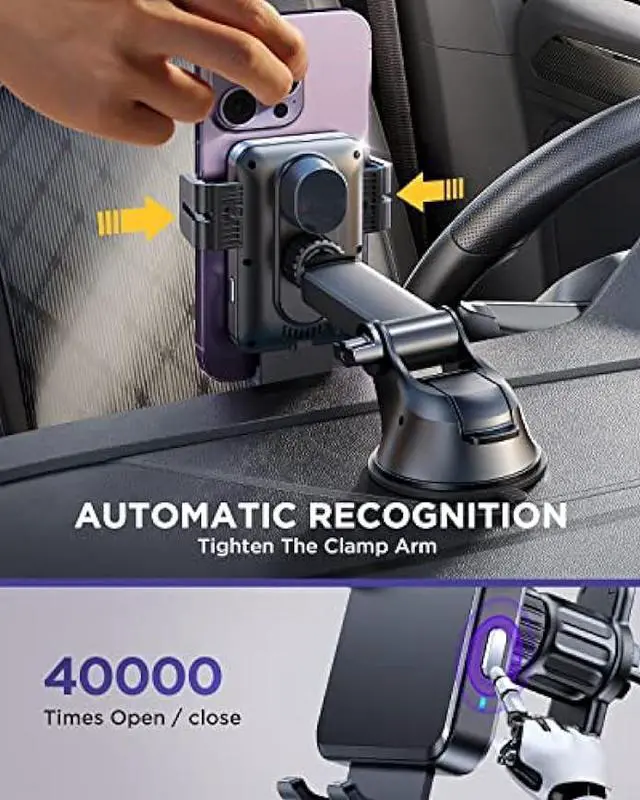 Super Stable Basephone mount for car wireless charger's base is equipped with a powerful suction cup and professional 3M adhesive (high temperature resistant). The base's suction cup has been tested thousands of times, it can absorb more than 20 pounds of objects without dropping. Even if passing speed bumps or driving on mountain roads, you dont need to worry about it falling. In addition, the bracket arm and clip are equipped with silicone pads for anti-slip and anti-vibration.