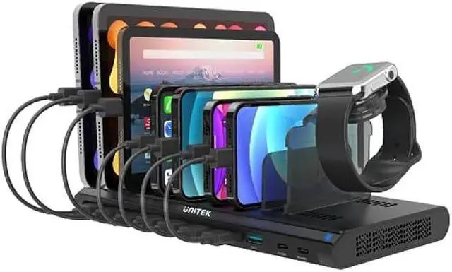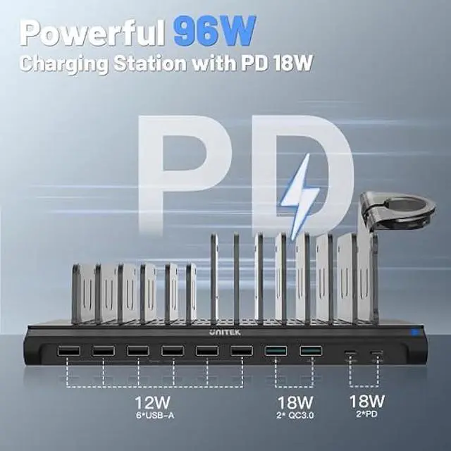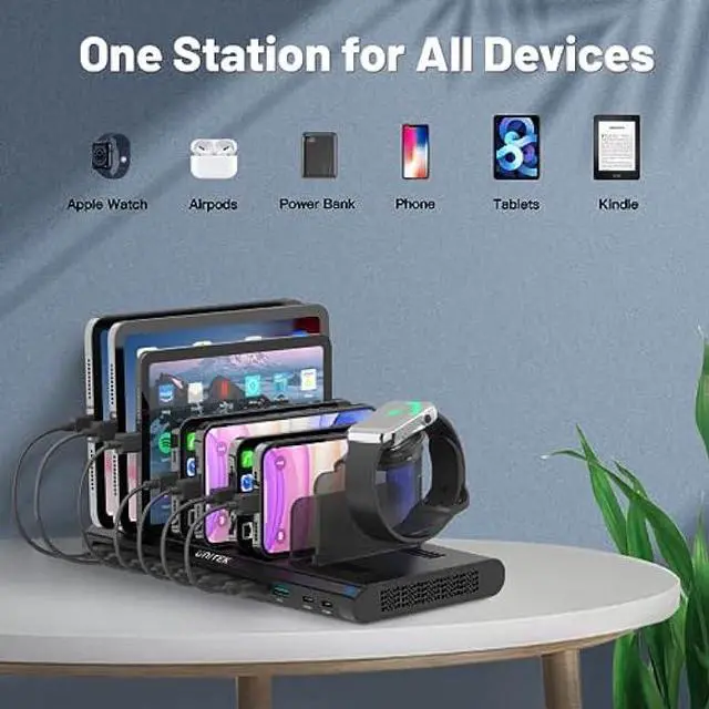 ADJUSTABLE DIVIDERS - Unitek USB C Charging Station adopts the design of Removable Dividers, and equipped with 7 tall + 6 short baffles+1 iWatch stand. You can assemble the removable bezel according to your needs to support a thick mobile phone or tablet. Based on the product ruler, the width of baffle can be adjusted to charge freely.