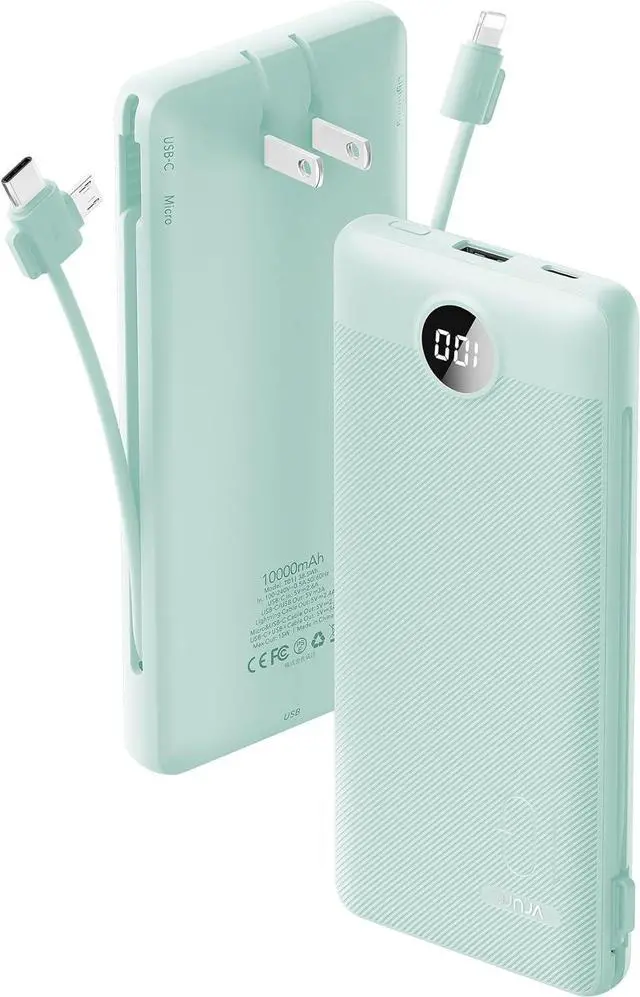 VRURC Portable Charger Built-in Cables and AC Wall Plug, USB C Power Bank 10000mAh, Travel Battery Portable Phone Charger Compact Lightweight External Battery Pack for Smart Phones, Tablets etc-Green