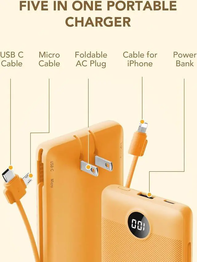 [Portable Charger With Built-in Cables and AC Wall Plug] This portable charger is not only has a built-in Micro cable, USB C cable, and other charging cable for iPhone, but also is equipped with a USB port, and USB C port. Also, Portable phone charger is built-in wall plug that charges the power bank itself directly from the wall outlet.