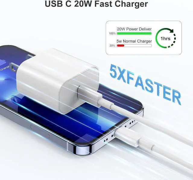 20W USB C Fast Charger for iPhoneiPhone Fast Charger equipped with 20W PD 3.0 USB Type C power delivery wall plug, PD 3.0 Quick-Charge USB C port can provide a maximum of 20W output power to charge your device The speed is 3 times faster than the original 5W charger, and it only takes 30 minutes to charge the iPhone 12 up to 50%, saving you more than 1.5 hours.