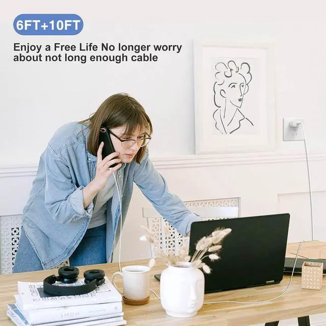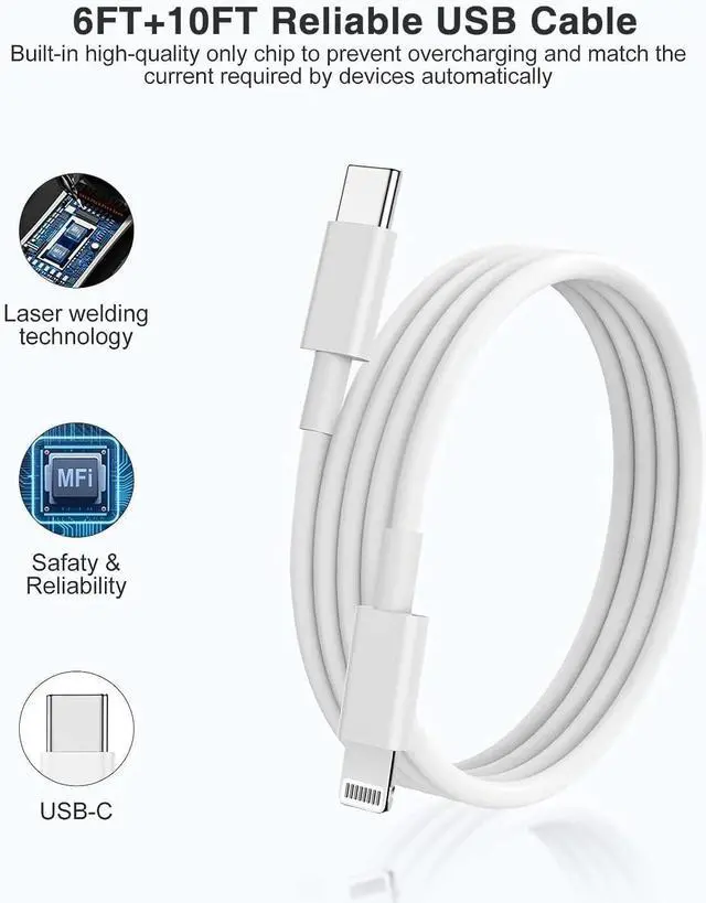 10FT USB-C to Lightning CableIncluded 6ft/10ft/10ft USB C to lightning cable, you can charge iPhone iPad or Airpods directly, USB-C to lightning cable offers fast charging and transfer technology, power output up to 2.4A mp, data transfer speed up to 480 Mbps. Fast charging cables and fast chargers are suitable for many places, such as home car office travel and so on.