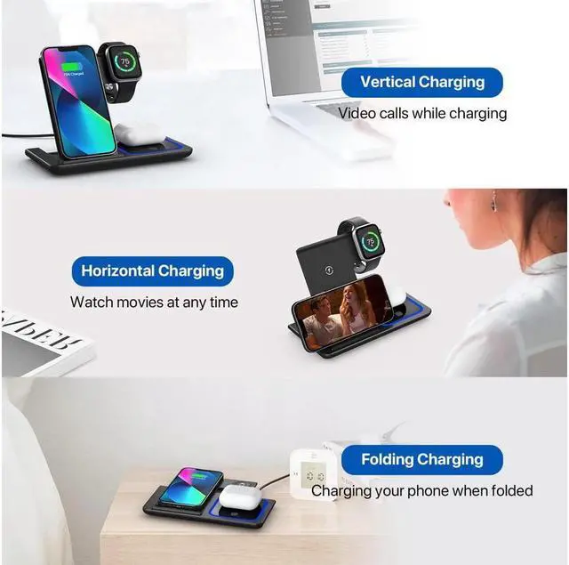 Portable & Foldable Travel Charger Stand: The charging station for iphone is foldable, light and portable, and can be put in a bag or suitcase. This wireless charging pad is not only suitable for your home, office, if you are traveling or on a business trip, bring this 3in1 charger, which can charge multiple devices at once. Also, Versatile as a cell phone stand with angle adjustment. it's as a charging pad, just leave the phone flat to keep it charging.