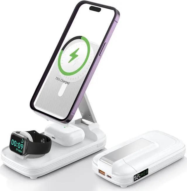5 in 1 Fast Wireless Charger Station- The wireless charging station is equipped with a 10000mAh power bank, which can fully charge the power bank in just 4 hours and supports Two Wired output 20W fast chargingType-C USB-ACan wireless charge iPhone, Apple Watch and AirPods at the same time. And the LED power display of the Charging Station is digital, you can see the power Remaining capacity of the power bank very clearly.
