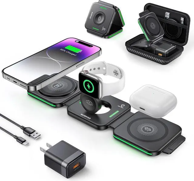 3 IN 1 Magnetic Wireless ChargerNew third-generation wireless charger features the"small ear"strong magnetic bracket design, which can be folded into a sturdy wireless charger stand to support three charging modes. This 3 in 1 wireless charging station for apple has upgraded its built-in magnet and the magnetic function of apple watch charger, achieving power in a snap. If you want to use the magnetic feature of this wireless charger, make sure the phone model is for iPhone 12/13/14/15 series.