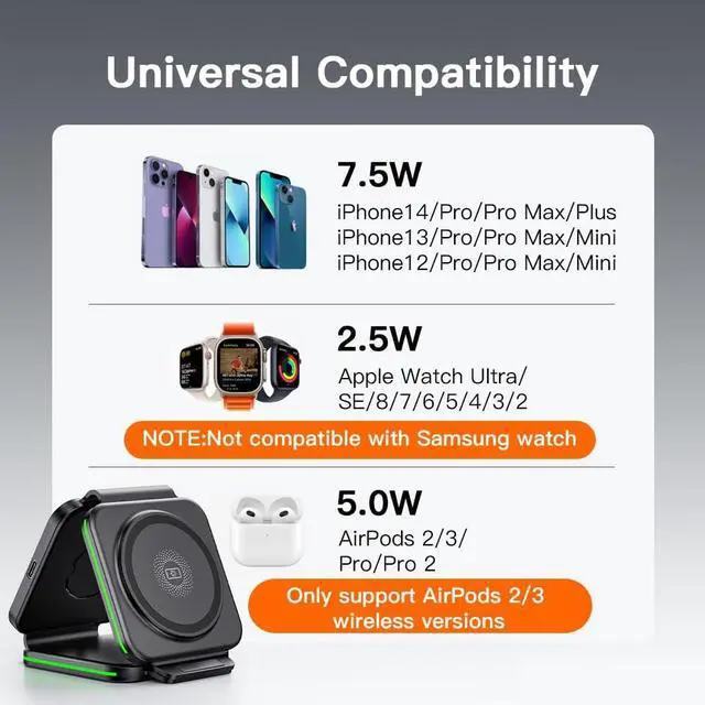 Wireless Charger for Your DeviceThis Wireless charging station for apple charge for iPhone, iWatch, and Airpods. The wireless charger is compatible with AirPods 2 with wireless case/AirPods 3/AirPods Pro and iWatch ultra/8/7/6/5/4/3/2/SE. The magnetic wireless charger supports wireless charging for iPhone 14/13/12 series.
