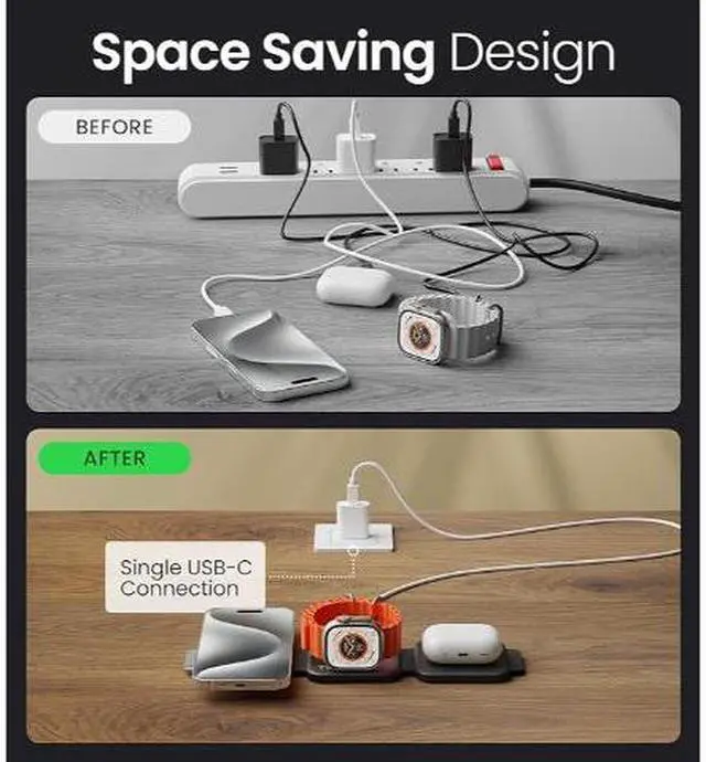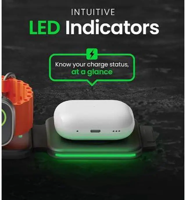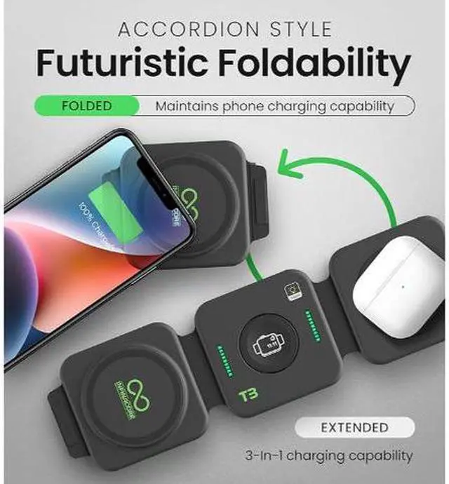 The InfinaCore T3 is a sleek 3-in-1 charging station for iPhone (15W), AirPods (5W), and Apple Watch (3W). With a foldable design, it's travel-friendly at 1.2" thick folded and 0.4" open. It doubles as a hands-free viewing stand with LED indicators for charging status, tailored for Apple devices for an efficient and luxurious experience