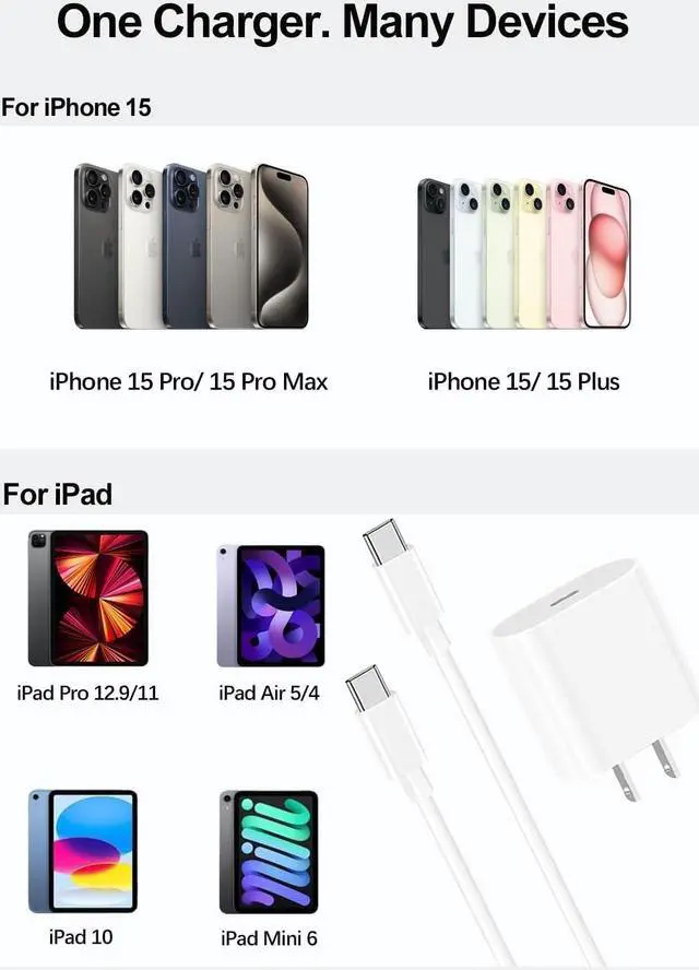 Universal USB C Charger - This new iphone charger compatible with iPhone 15/15 Pro/15 Pro Max/15 Plus, 2022/2021/2020/2018 iPad Pro 12.9 inch 6th/5th/4th/3rd, iPad Pro 11 inch 4th/3rd/2nd/1st, 2022 iPad Mini 10th Generation, iPad Air 5th/4th Generation, iPad Mini 6th Generation.