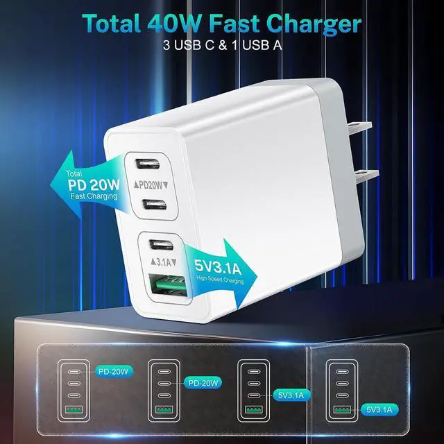 USB Wall Charger Multiport: usb c wall charger with 3 USB-C port and 1 USB-A port, 2*20 W PD charging ports and additional 2*terminals for 5 V/ 3.1. Type C Charger loaded with 20W (MAX) output power. You can charge up to 4 devices simultaneously at high speed.