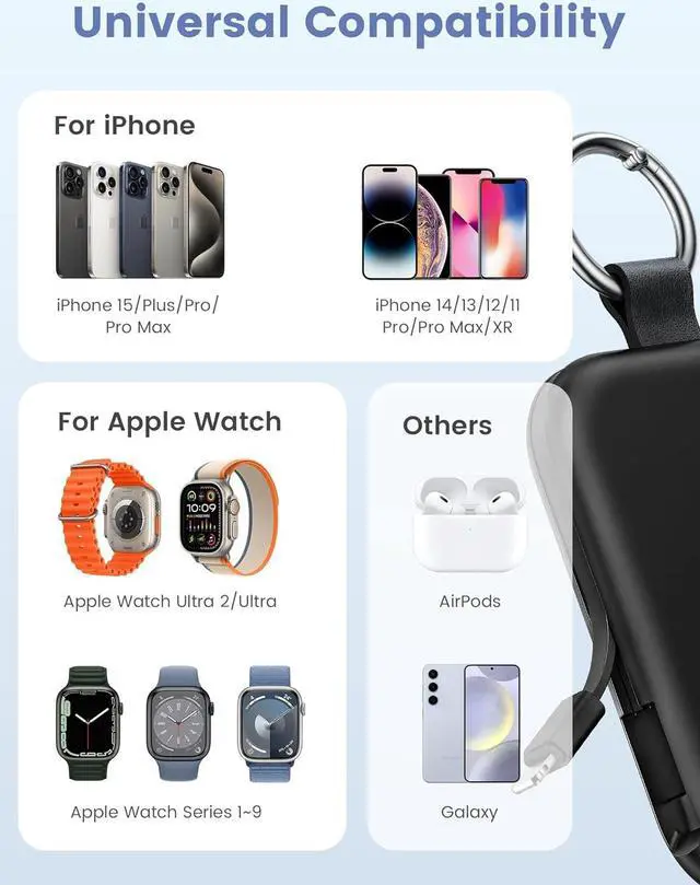 Portable Travel ChargerCompact and lightweight keychain design, you can easily put this portable charger in your pocket or hang it on your backpack, which is a great travel companion.