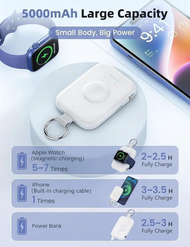 5000mAh Large Capacity Battery PackThis 5000mah Apple Watch and iPhone portable charger can charge your iWatch about 7~10 times, for iPhone 15 about 1 time, for AirPods about 6~8 times, takes only about 3 hours to fully charge the Power Bank.