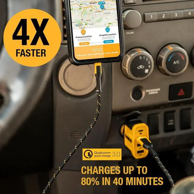 Heavy-Duty Construction Car charger adapter designed with a durable, rugged exterior stands up to repeated wear and tear