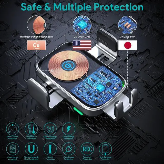 15W Fast Charging, Superior Safety Equipped with the latest auto power recognition chip, our wireless car charger provides a robust 15W output, boosting your phone to 50% in just 30 minutes. Over 5 years or 4, 000+ charge cycles lifespan. Certified by UL, FCC, CE, and RoHS, the car charger integrates multi-protections against overheat, over-voltage, short-circuits, and FOD. An internal cooling fan and back ventilation holes ensure it remains cool, even during extended charging sessions.