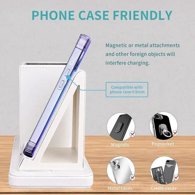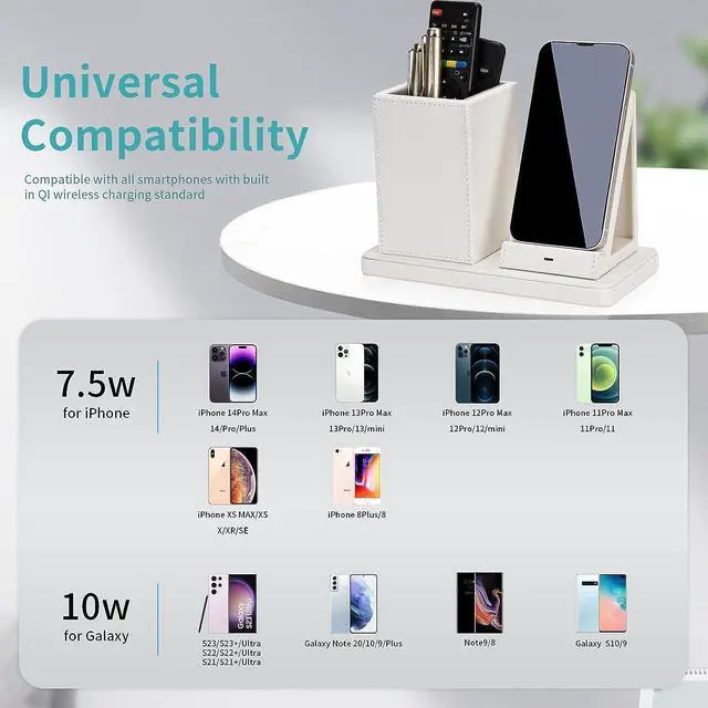 Widely CompatibilityThis charger desk organizer is suitable for smartphones with built-in Qi wireless charging standard. For example, iPhone 14/14 Pro/13/12/11 etc, Samsung Galaxy S23/S22/S21/S20/Note 20/Note 10 etc.